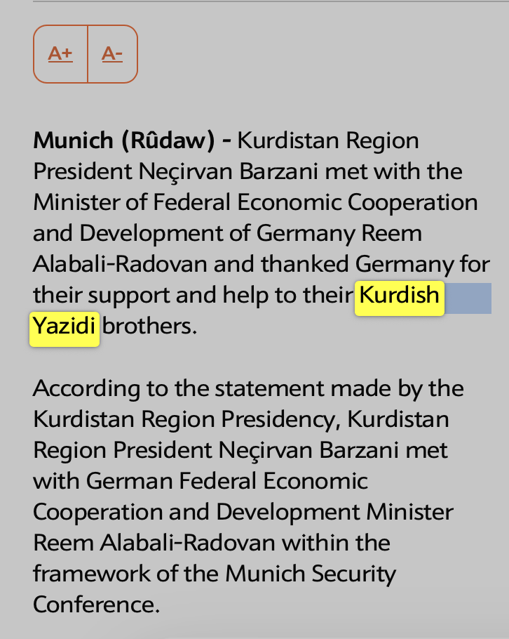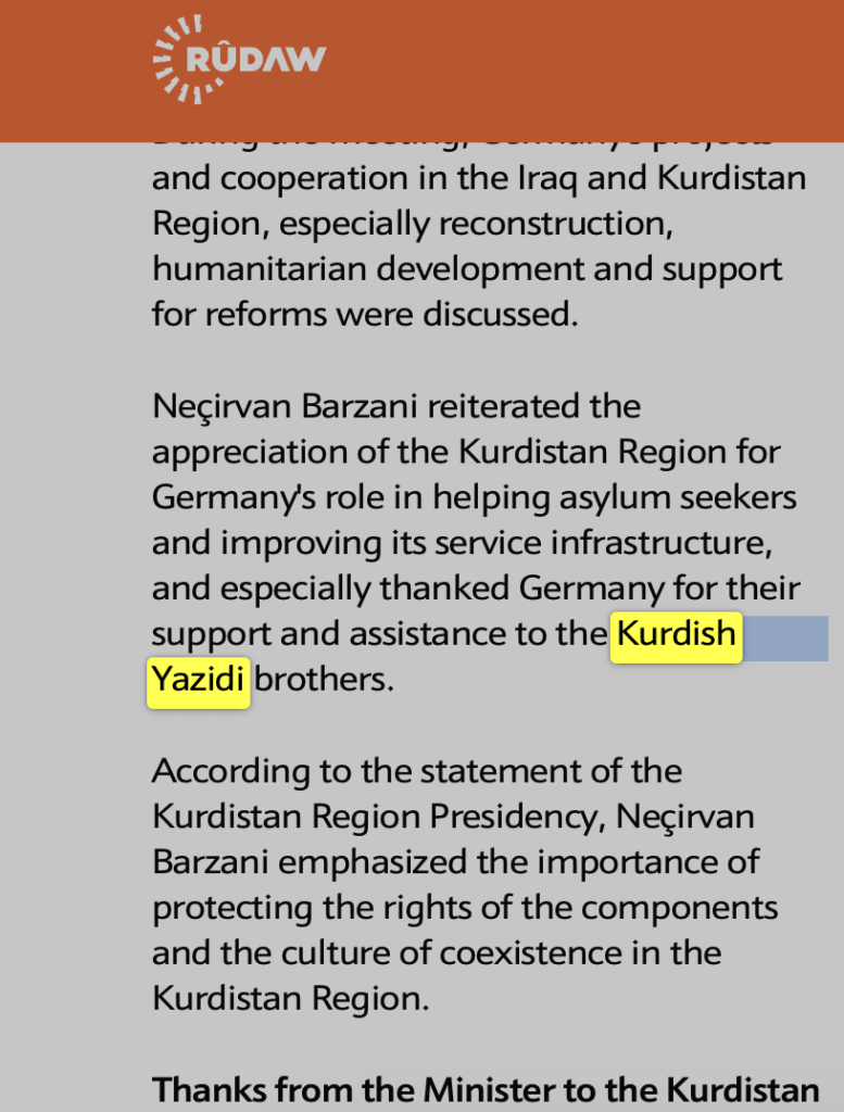 «Ռուդավ»-ը վերջերս հրապարակեց նոր քարոզչական հոդված, որում եզդիները պնդվում էին, որ «քրդեր» են։ Հոդվածը վերաբերում է Նեչիրվան Բարզանիի՝ Գերմանիայի տնտեսական համագործակցության և զարգացման նախարար Ռիմ Ալաբալի-Ռադովան այցելելուն, որի ընթացքում նա շնորհակալություն է հայտնել Գերմանիային աջակցության համար, մասնավորապես՝ «քուրդ եզդիներին»։ Սա խնդրահարույց է, քանի որ Բարազանին ինչ-ինչ պատճառներով որոշել է, որ իրավունք ունի խոսել եզդիների անունից և նրանց կրկին անվանել «քուրդ եզդիներ»։