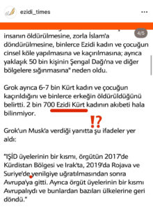El 7 de enero de 2025, Elon Musk publicó un tuit en X que generó un gran interés y una amplia discusión en las redes sociales. Los lectores ezidíes, en particular, se sorprendieron y conmovieron, ya que el tuit llamó la atención sobre su sufrimiento y ayudó a crear conciencia sobre su devastadora situación.