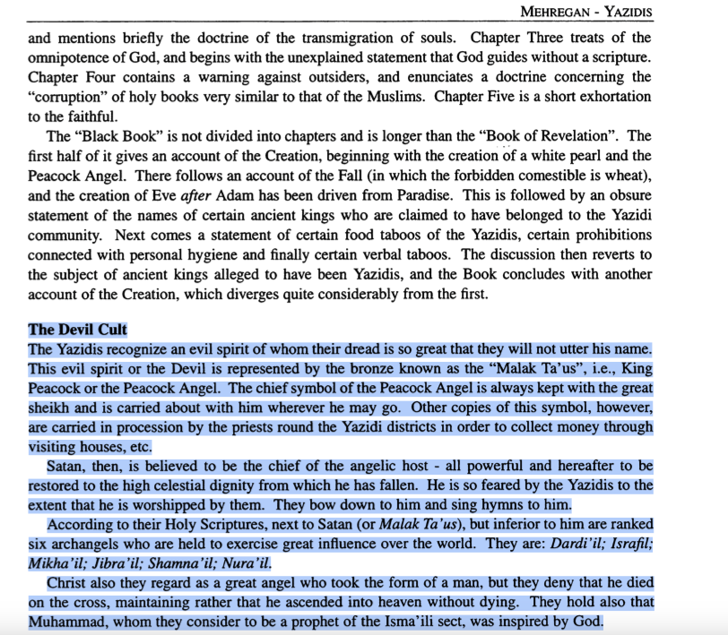 He claims that Ezidis recognize an “evil spirit” whom we supposedly dread, and somehow, he links the Ezidi faith to “satan”: