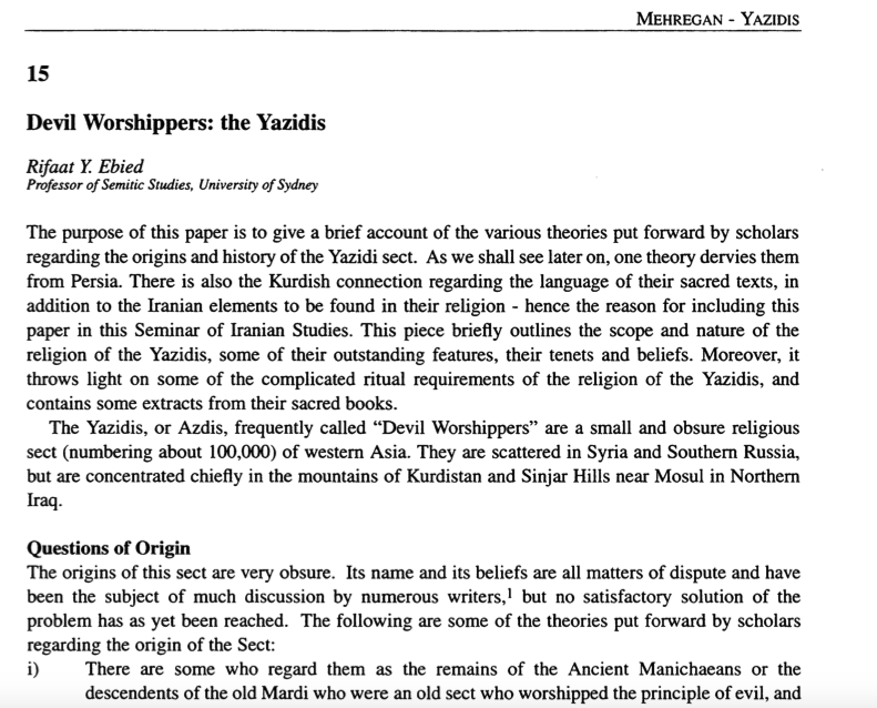 This time, our focus is on a so-called Emeritus Professor, Rifaat Y. Ebied, who claims to specialize in Semitic Studies. This Mr. Rifaat Ebied published an article in 2008 in which he refers to the Ezidis as a sect and as devil worshippers. Although the Ezidis are unfortunately accustomed to such false and absurd misinformation, it is particularly disturbing when someone from the academic world promotes the same theories that ISIS believes in. It remains unclear what sources Rifaat Y. Ebied based his claims on or which researcher is originally responsible for this misinformation. It only takes one person to make such claims—whether intentionally or by mistake—for others to follow blindly like a flock of sheep. One particular passage in his work is especially concerning, although the entire chapter about Ezidis is appalling. It is deeply troubling that some researchers publish work on issues and topics they have not properly researched.
