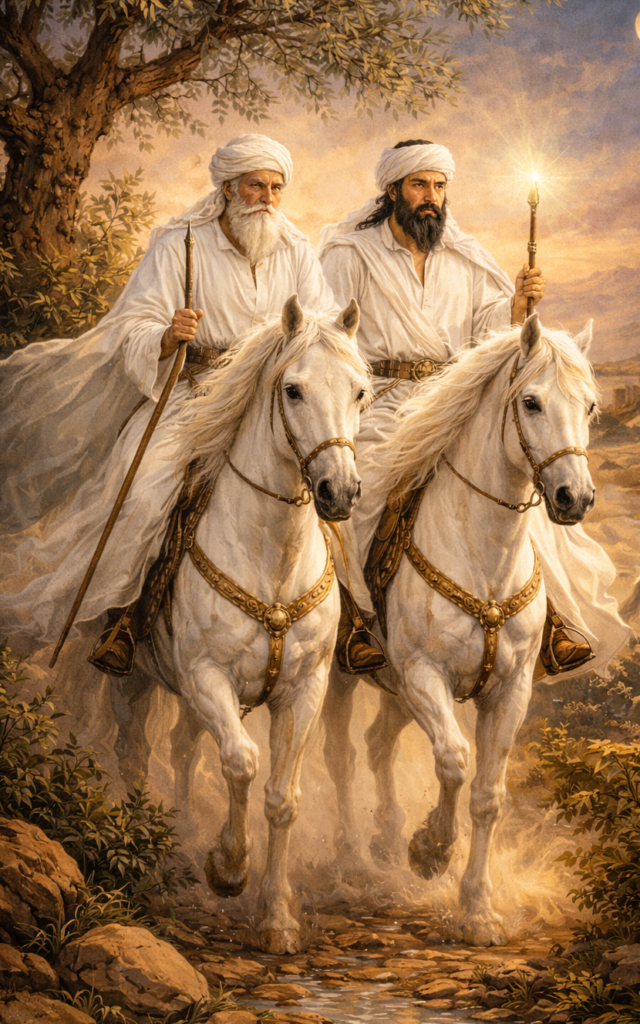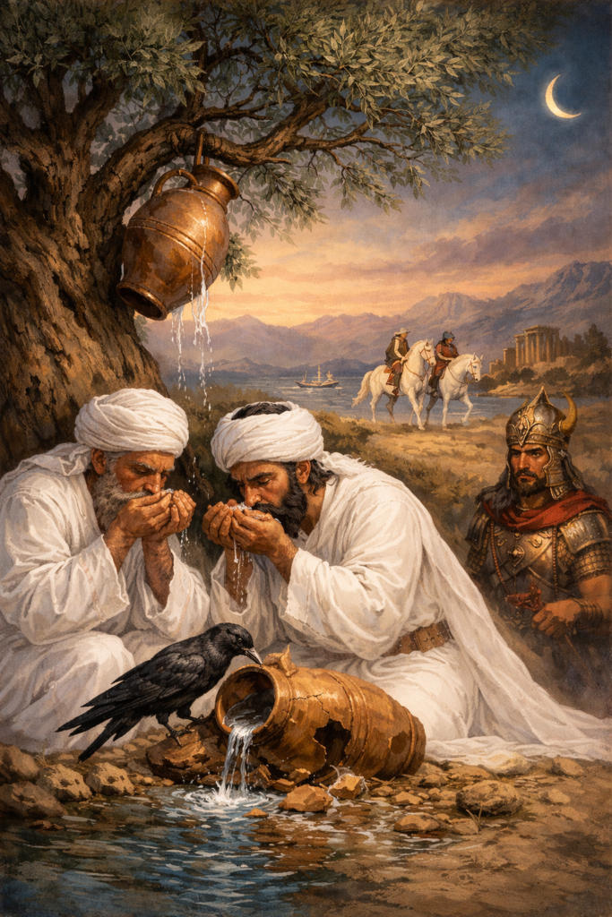 AI-generated image which illustrates the story of Xidir Êliyas and Xidir Nebî drinking from the Water of Life under an olive tree, with a raven at the broken jug and Alexander the Great watching. White horses in the background symbolise their eternal journey of blessing and protection.