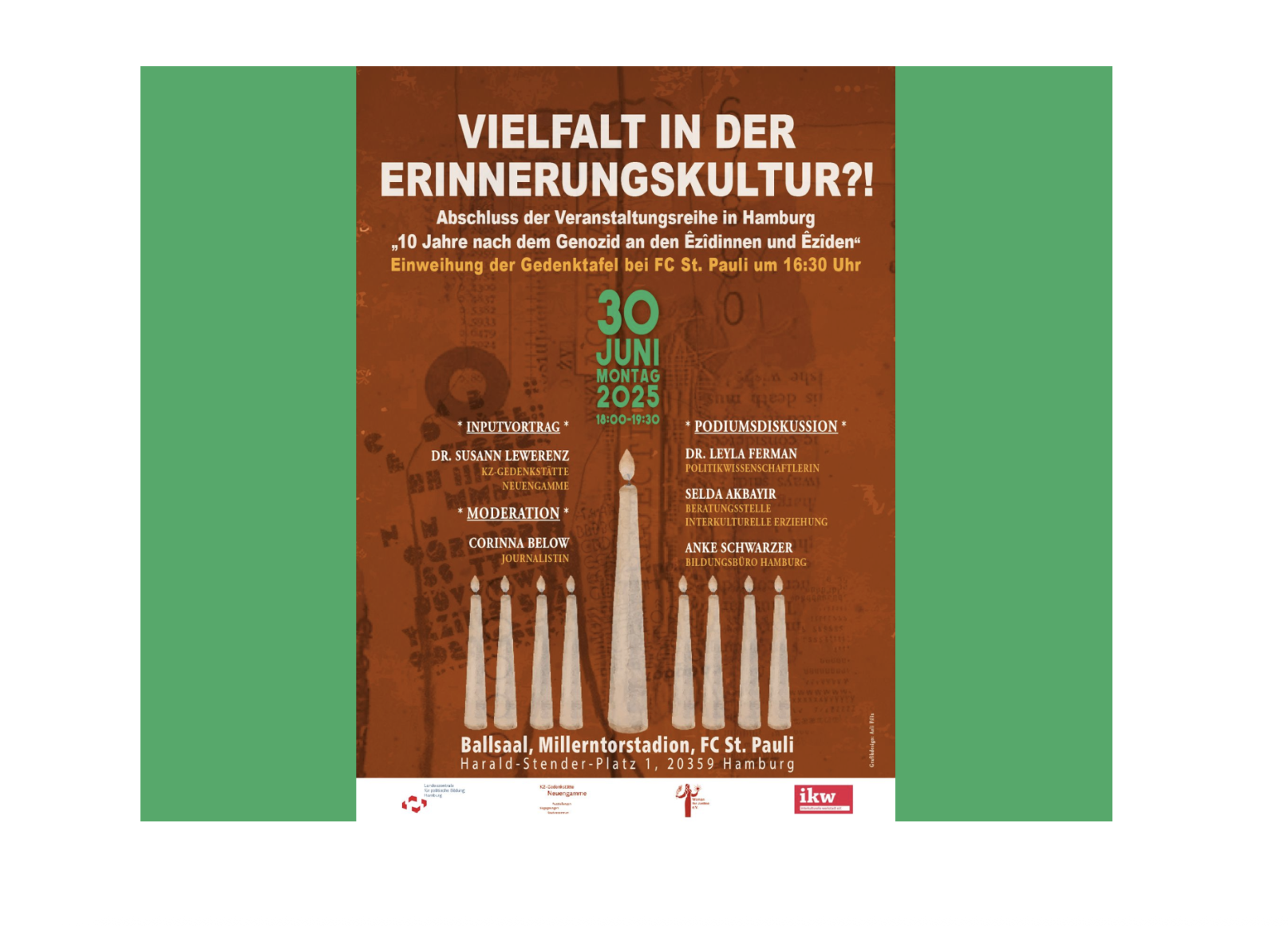 The final day, 30 June, began with the placement of commemorative plaques on trees in Hamburg at 16:30, a quiet act of tribute to the Ezidi victims and survivors. Later, at 18:00, the closing event took place in the Ballsaal of the Millerntor Stadium, home of 1. FC St. Pauli, bringing together speakers and guests to discuss Culture of remembrance and diversity.
