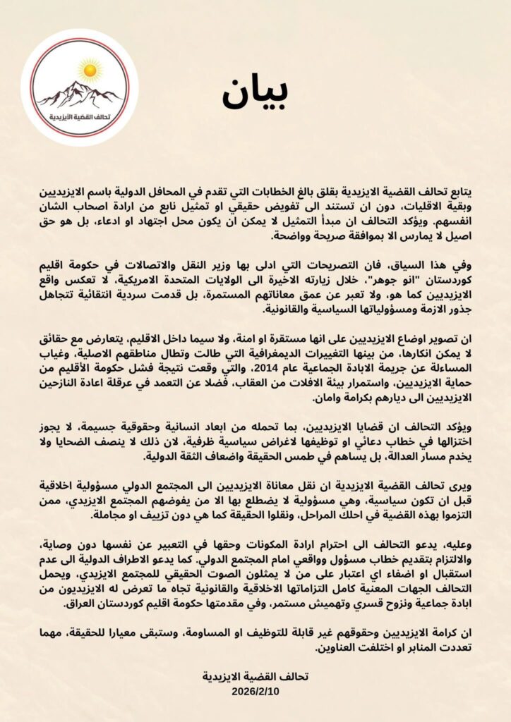 Abdoka, a KRG official, discussed the conditions of religious and ethnic minorities in Iraq and Syria, including the Yazidis, during the International Religious Freedom Summit. He spoke about the importance of implementing the Sinjar Agreement, protecting political representation through quotas, and removing armed groups from Ezidi areas. While these topics are critical, the Yazidi Cause Alliance warned that Abdoka’s statements did not reflect the true situation on the ground, particularly ongoing displacement, lack of accountability for the ISIS genocide, and demographic pressures in Sinjar.